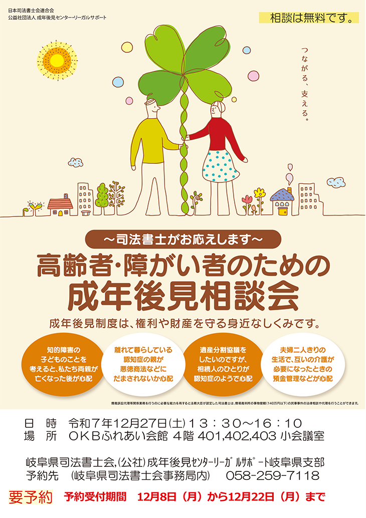 公益社団法人成年後見センター・リーガルサポート岐阜県支部では、下記のとおり、無料成年後見相談会を開催いたします。お気軽にご相談ください。